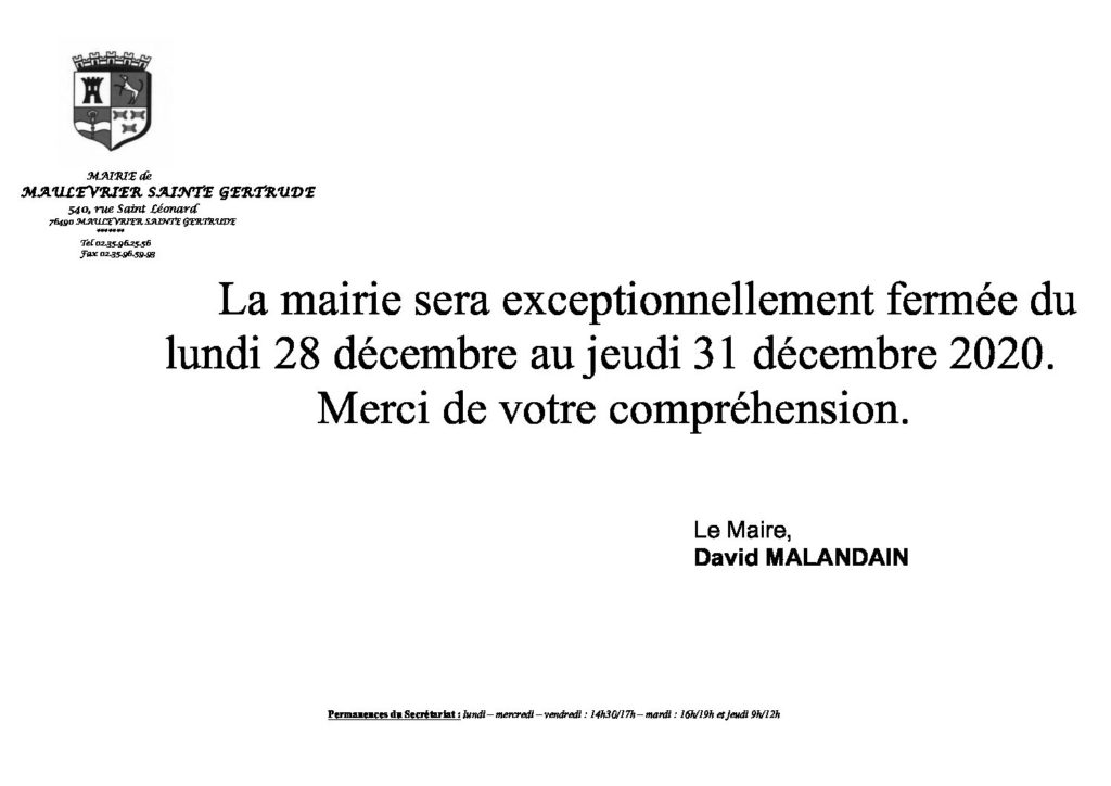 Fermeture exceptionnelle de votre Mairie de Maulévrier Ste Gertrude